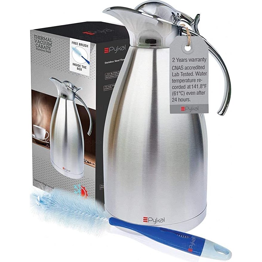 PYKAL 68Oz/2 liter Stainless Steel Thermal Carafe: Durable Design with Exceptional Heat Retention, Certified to Maintain Temperature Above 140F for 24 Hours; Includes 2-Year Warranty and Free Cleaning Brush; Sleek Satin Finish
