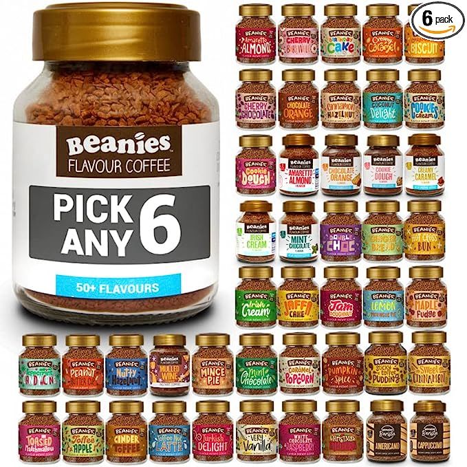 Beanies Flavored Instant Coffee Bundle of 6 Jars (50g) with Over 50 Flavor Options (Various Blends, Barista, Decaf), Including Turkish Delight, Chocolate Orange, Chai Latte, Cookie Dough, Hazelnut, Caramel, Vanilla, and Many Others!