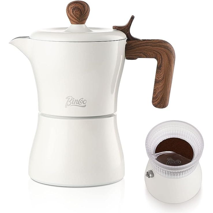 White Bincoo Stovetop Espresso Maker Moka Pot - 3 Cup Capacity. Enhanced with Dosing Ring Dispenser for Cuban Coffee and Traditional Italian Espresso. Stove Top Coffee Maker, Authentic Moka Pot Design.