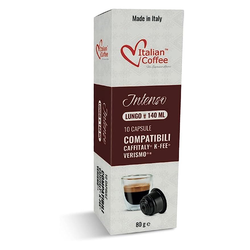 Discover the rich and satisfying taste of Lungo Intenso coffee pods, a meticulously crafted blend of Arabicas designed to deliver a well-balanced and enjoyable espresso experience. With a generous serving size of up to 4.5 fl oz, you can indulge in a larger cup without compromising on flavor. These Italian coffee pods are compatible with Verismo, CBTL, Caffitaly, and K-Fee coffee machines, guaranteeing the authentic taste of real Italian espresso. The bundle pack includes 8 boxes of 10 pods each, providing you with a plentiful supply of 80 pods. Embrace the true essence of Italy with this 100% Made in Italy product and make every cup a true delight.
